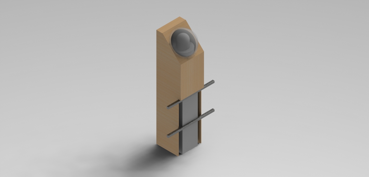 I decided to use 3/4 inch birch plywood from Home Depot. Here’s the CAD model I made using Solidworks. The clear dome was a generic acrylic dome made for security cameras. The housing is fixed to the railing with L-brackets.